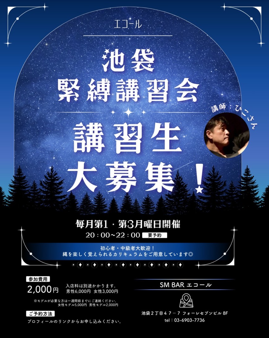 4月20日(月)縄講習 2026/03/21 昼エコール担当 はっぱ隊長。リーフレクチャーが受けられます。縄のワンポイントアドバイスです。レクチャーを受けたら、キャスドリお願いします。夜エコール担当 はるる。20時~ひこさんの縄講習です。+2000円で2時間です。モデルの方はチャージ無料、ソフドリ一杯つき。モデル派遣をご希望の方は1週間前までにお申し付けください。